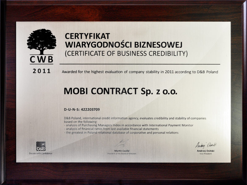 Wir sind das Mitglied der Polnischen Industrie - und Handelskammer und wir sind auch stolz auf das Zertifikate von Business Glaubwürdigkeit. Zufriedenheit von unserer Kunden ist unsere Priorität. Wenn Sie Fragen haben, stehen wir Ihnen jederzeit zur Verfügung.